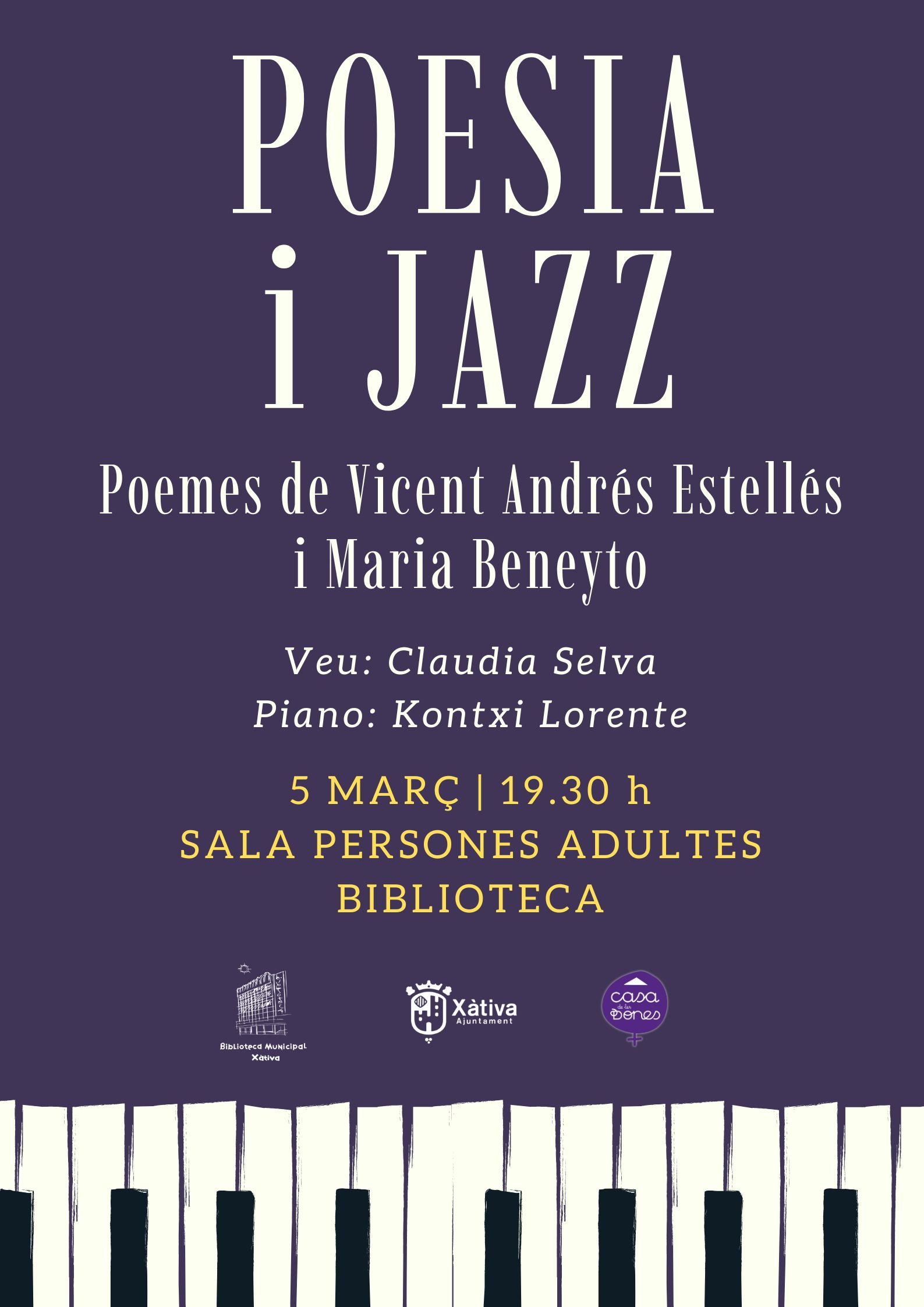 Pel dia de la dona, a la Biblioteca tindrem un recital de poemes de Vicent Andrés Estellés i Maria Beneyto, amb acompanyament de piano.