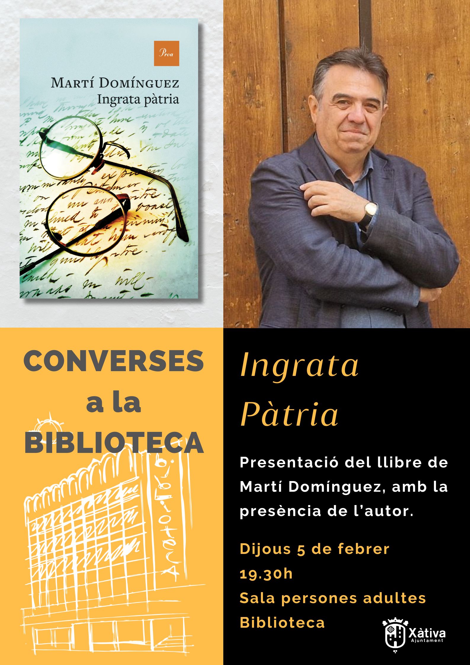 Dijous 5 de febrer es presentarà a la Biblioteca de Xàtiva l'últim llibre de Martí Domínguez: "Ingrata pàtria". Serà a la sala de persones adultes a les 19.30h. En aquesta novel·la, Martí Domínguez s’endinsa en les tres darreres hores de la vida del professor Peset abans de ser afussellat a l'any 41, en els seus […]