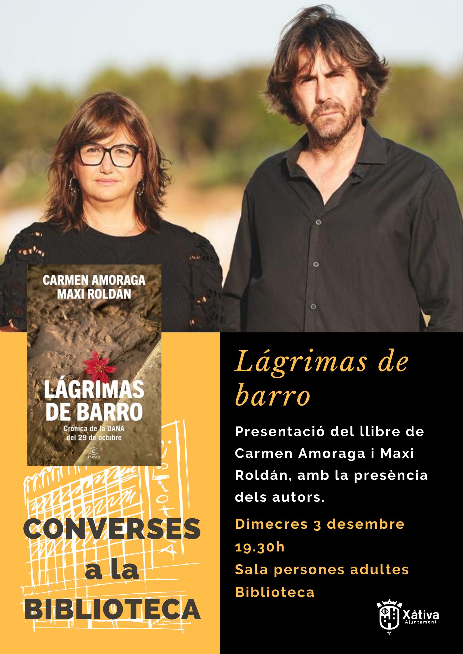 El miércoles 3 de diciembre, se presentará en la Biblioteca el libro "Lágrimas de barro", con la presencia de Maxi Roldán y Carmen Amoraga, autor y autora del libro. Será en la sala de personas adultas, a las 19.30h.